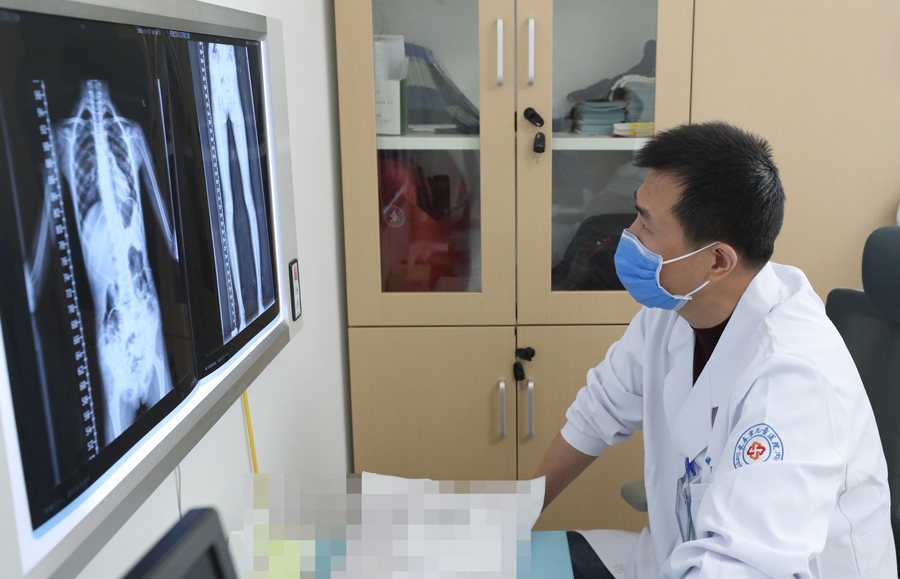 ▲ 李浩教授为8月18日先天性胫骨假关节手术患儿复查