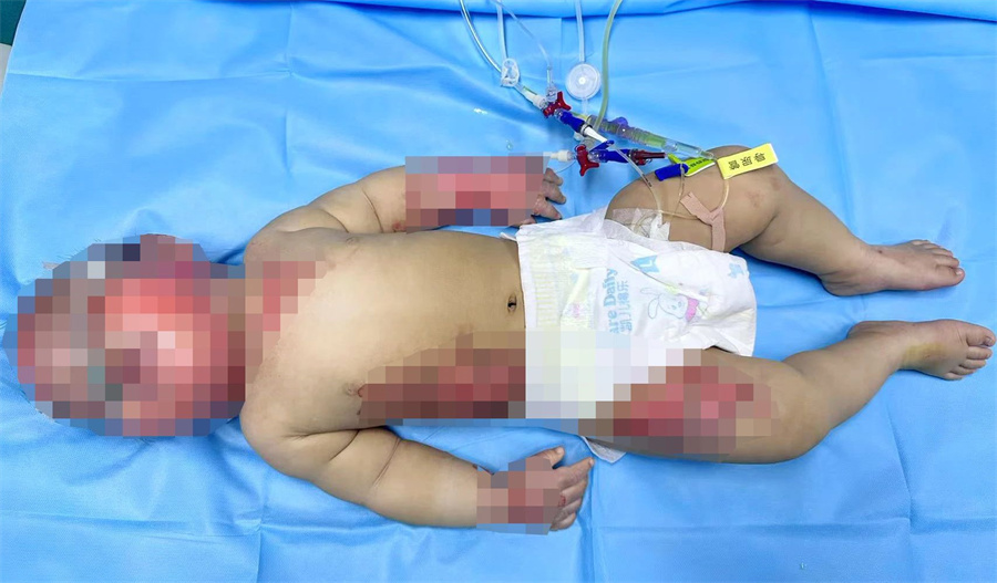 据老人讲,孩子只有9个月大,刚刚学会走路。在老人不注意的时候,孩子拽翻了刚烧开的水壶。滚烫的热水无情地浇在孩子身上。雪上加霜的是,老人患有脑梗,孩子父母离异,家中非常困难。