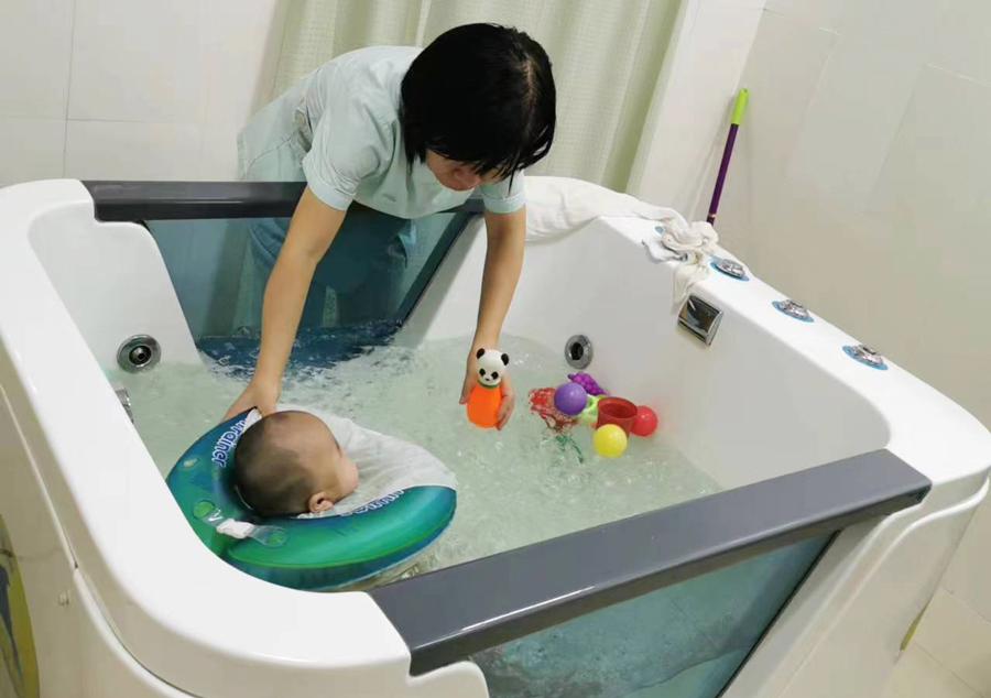 采用的是消毒净化水,利用水的温度、水静压、水的浮力和阻力,达到降低肌张力,提高运动能力,缓解肌痉挛,改善关节屈伸活动。水疗推动患儿旋转不断地改变重心,训练平衡能力。在水中可以自由进行头控训练,站立训练等;水的阻力作用有利于提升肌力及耐力,有效促进婴幼儿大脑和神经系统的正常发育。使呼吸运动加快,改善呼吸功能,提高心肺功能。适用于小儿脑瘫、关节功能障碍、异常运动姿势、发育迟缓、脑炎脑外伤后遗症、各种神经损伤等。