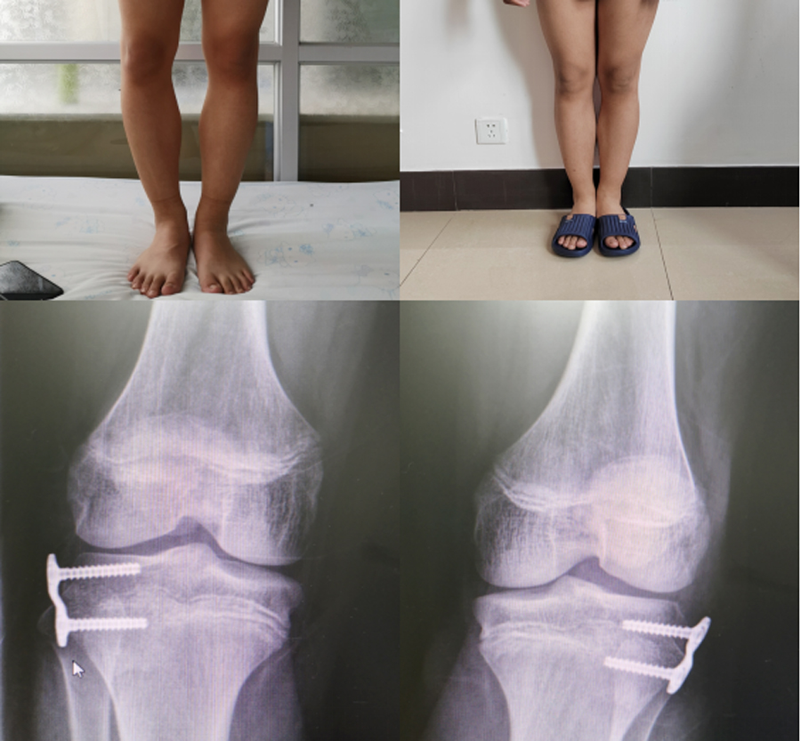 膝内翻畸形(“O”型腿)通过骺板阻滞引导性生长技术,1年后得到纠正,术后即可下地行走。