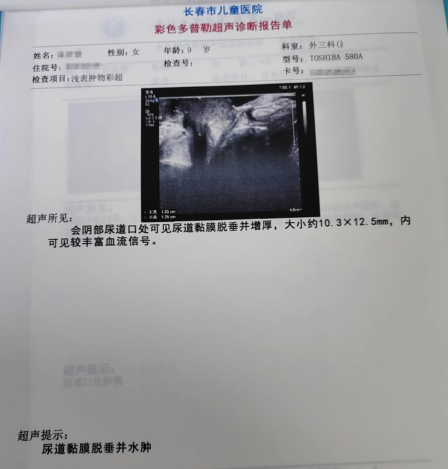 儿童女科医生为小红进行了细致的查体,初步诊断为尿道黏膜脱垂。为验证诊断结果,他们立刻请医院泌尿、烧伤科专家进行会诊。通过仔细查体,医生发现小红的阴道口完整,肿物来源于尿道口,通过彩色多普勒超声检查,显示其会阴部尿道口处可见尿道黏膜脱垂并增厚,大小约为10.3mmX12.5mm,内可见丰富的血流信号,泌尿、烧伤科专家根据检查结果,也诊断小红是尿道黏膜脱垂并水肿。