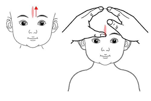 开天门:两眉毛中间至前发际成一条直线,两拇指自下而上交替直推30-50次。