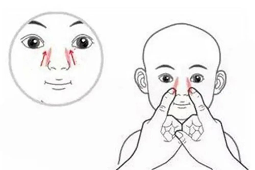 推擦鼻梁:用双手食指指腹自鼻梁两侧鼻翼处开始至鼻根部,来回推擦30下,至鼻梁发热,慢慢揉着一般能出来些鼻涕。