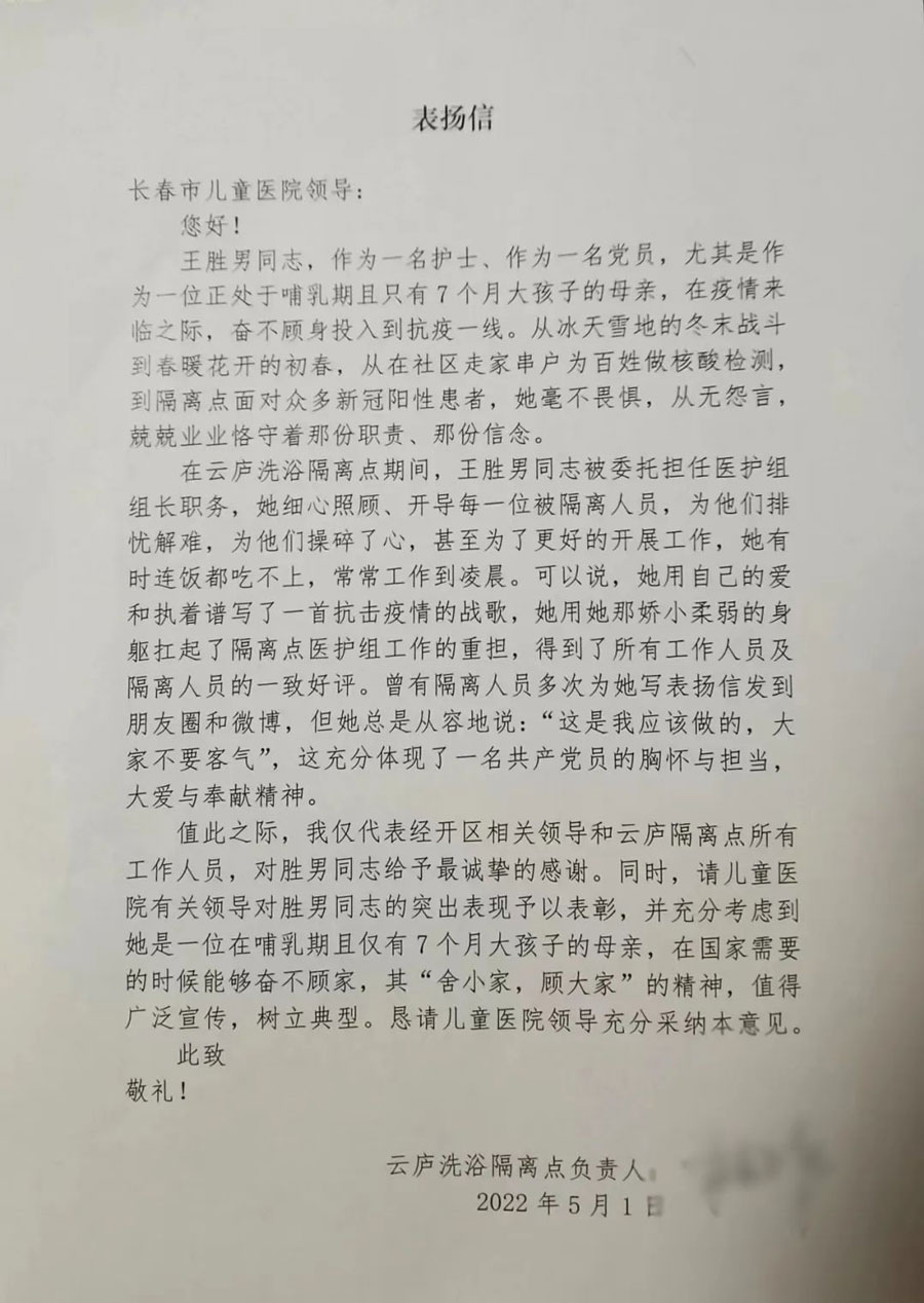 在抗疫现场,王胜男如暗夜中一颗明亮的星,熠熠生光。一封《表扬信》见证了大家对她的认可。她以实际行动践行党全心全意为人民服务的宗旨,履行医护人员救死扶伤的职责。她是一名党员、一名护士,听党指挥、洁白在身,敢于担当、责任在心。