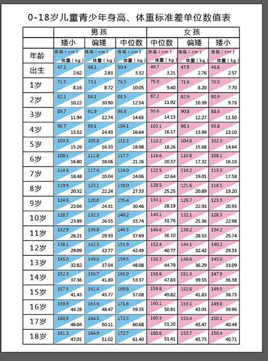 家长可以通过比对儿童身高体重百分位数值表,定期监测孩子身高。如按照下方表格,年龄为周岁,如果孩子年龄对应的身高在矮小上,则需要到门诊进一步检查,明确原因。