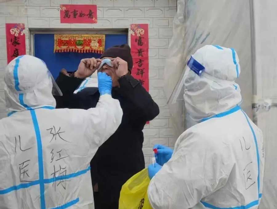 在沿河社区里,张红梅等人经历过多次“夜战”。一次次爬楼,一次次手消,汗水浸湿了衣服,雾气遮住了视线。其塔木镇漫天大雪里,“儿医人”坚定的背影让张红梅永远铭记。她们踏雪走进每一户家里,爬上火炕、蹲在桌边、跪在雪地里,不一样的采样姿势,同样的真诚。