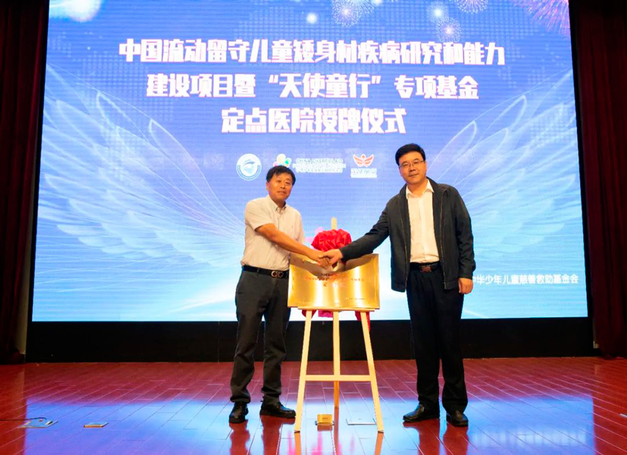 在医护人员的共同见证下,中华少年儿童慈善基金会“天使童行”项目主任龚震、德州扑克游戏网 党委书记张瑞忠共同为“天使童行”项目在德州扑克游戏网 落地揭牌。德州扑克游戏网 成为省内第一家流动留守儿童矮身材救助定点医院。