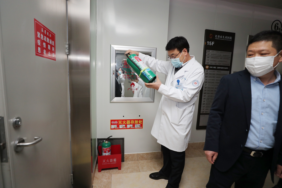 于占新副院长在现场考察了职工对灭火器的操作,询问了医护人员向患者宣传安全常识的情况,要求职工熟练掌握灭火毯的使用方法,加强危化品的管理,尤其是严格做好酒精的使用和出库管理。