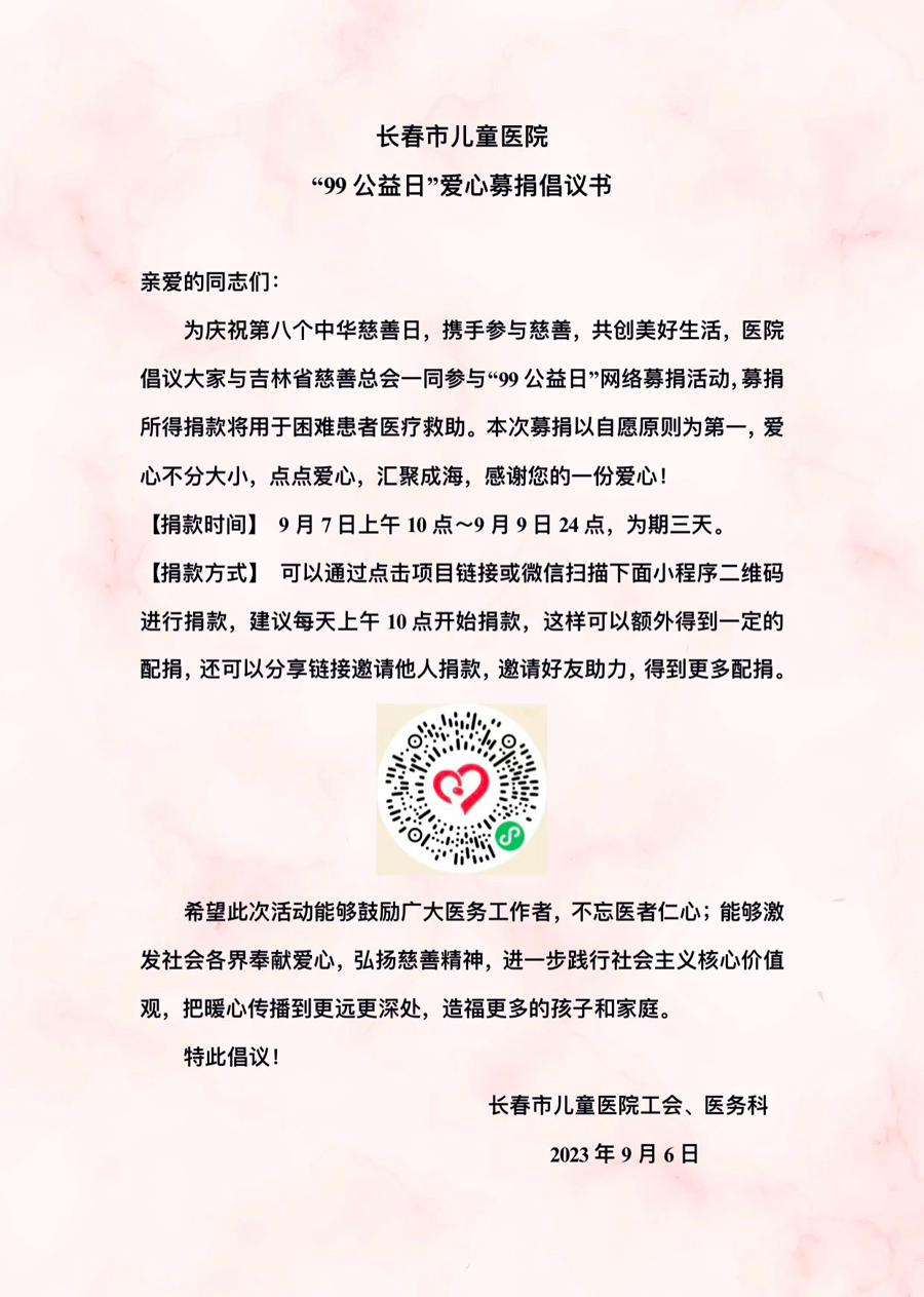 弘扬中华传统美德,助力慈善事业发展。为庆祝第八个“中华慈善日”,9月7日—9月9日,德州扑克游戏网 工会、医务科组织全院职工,与吉林省慈善总会共同参与“99公益日”网络募捐活动,携手参与慈善,共创美好生活。