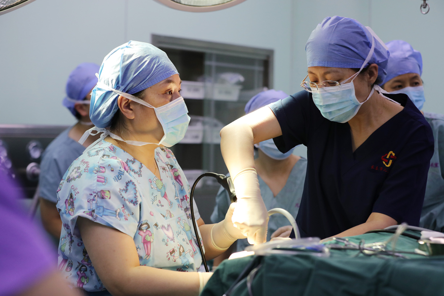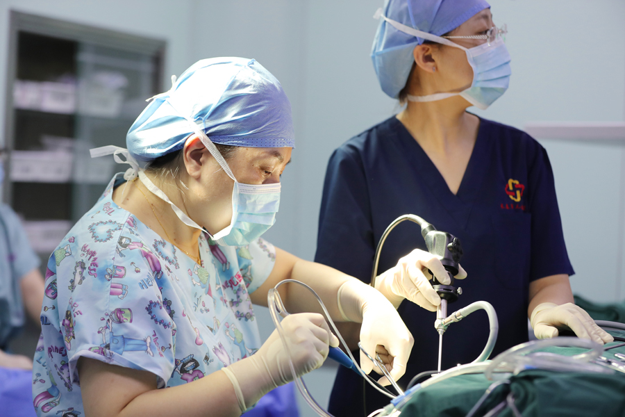 张薇副院长在内镜辅助下再一次明确肿物边界,设计切口,应用低温等离子刀,沿着肿物的边界消融、剥离、止血,麻醉医生、手术室护士以及手术助手默契配合。