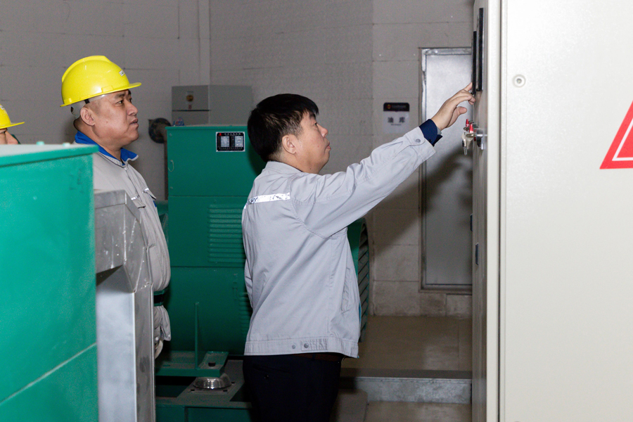 当日早上9点,德州扑克游戏网 高压变电室,电工班全体成员严阵以待。一场以“主、备用供电线路全部停电,启用柴油发电机组”为背景的模拟演练拉开帷幕。当极端情况发生后,电力维修人员根据电工班长的指令,首先检查主、备用电源,确认没有电流后,分离主、备用电源高压隔离开关,合并主、备用电源接地刀。随后,电工班人员进入发电机房,在检查和确认发电机油量后按下启动开关。伴随着巨大的轰鸣声,两台各700千伏安的柴油发电机组启动。维修人员立即按照流程实施了“合并发电机组输出主开关、合并高压变电室主授柜、合并低压柜发电机开关和联络开关”等一系列操作,短时间内完成了发电机组启动送电流程。