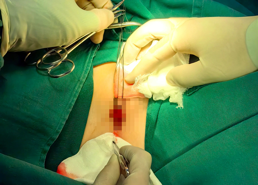 “为了减轻孩子的痛苦,必须尽快手术。”泌尿、烧伤科主任谢方达决定为小红实施脱垂尿道黏膜切除手术。手术的关键点在于要准确找到脱垂黏膜与正常尿道黏膜的分界点,在完成切除病变黏膜的同时,不能损伤正常的器官和组织。为此,谢方达主任与手术团队反复商讨手术的每一处细节,并做好应急预案,确保万无一失。11月17日中午,手术按照既定的方案有条不紊地进行。首先在膀胱镜的探查下,发现小红的膀胱黏膜光滑、未见占位及小梁样结构,近端尿道黏膜也光滑完整,进一步证实了脱出的肿物为远端的尿道黏膜,遂采用脱垂尿道粘膜切除术治疗。严重的黏膜充血水肿使肿物变得质脆且极易出血,必须在尽量减少钳夹次数的下尽快切除。很快,病变交界处黏膜组织被找到,谢方达主任在精准的裁剪下,完整地将脱垂尿道黏膜切除后重建尿道外口,留置尿管后手术顺利结束。