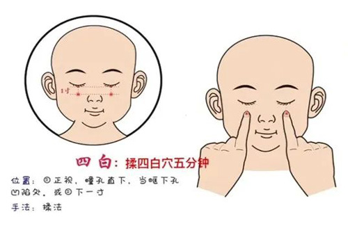 ▼揉四白:四白位于面部,眶下孔处。操作时用食指的指腹按揉,找出酸胀感最显著的一点,做灵活的揉动。