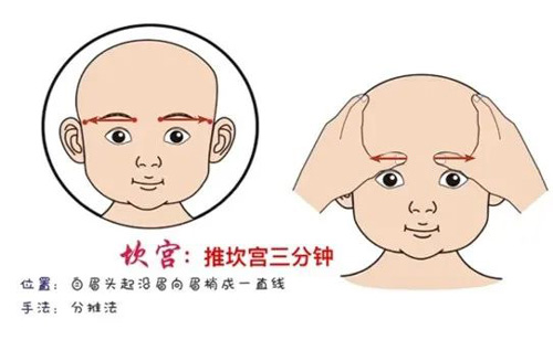 ▼推坎宫:坎宫位于面部,从眉头至眉梢,呈一条直线,左右对称。操作时用两个拇指从眉头向眉梢;