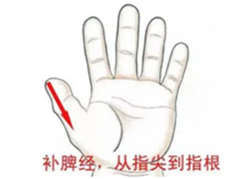 操作方法:将患儿拇指屈曲,循拇指桡侧边缘由指尖向指根方向直推称补脾经,推100-500次。