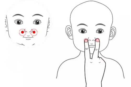 按揉迎香穴:位于鼻翼外缘中点旁,当鼻唇沟中,用双手食指指腹揉按迎香穴。